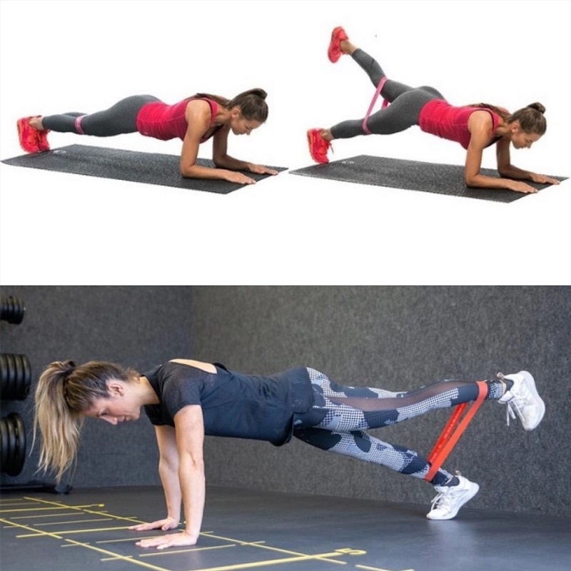 Bài tập Plank đá chân 2 bên kết hợp với dây kháng lực giúp bạn có một vòng eo thon gọn và giảm mỡ thừa hiệu quả. cách thực hiện như sau: