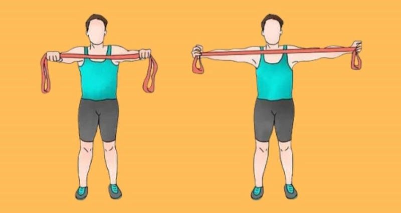 - Bước 3: Kéo dây kháng lực lên trên và ra hai bên cho đến khi hai tay của bạn ngang ngực hoặc cao hơn. Giữ vị trí này trong vài dây. Từ từ trở về vị trí ban đầu.
