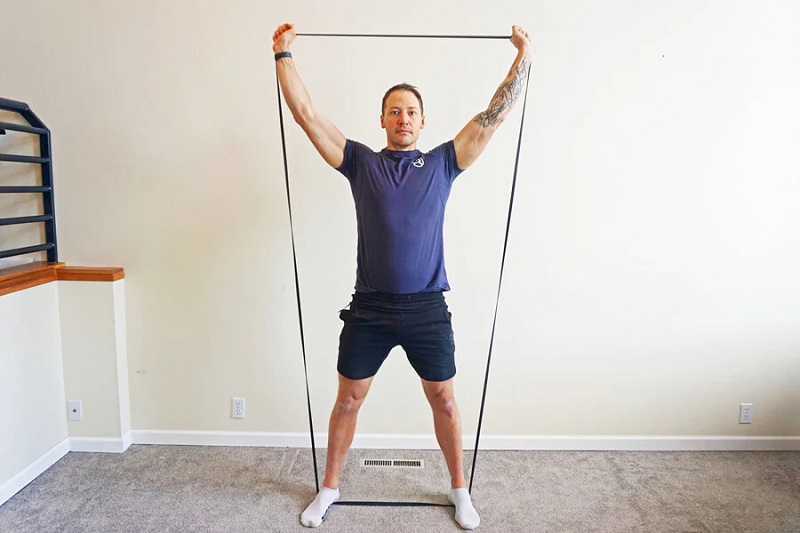 Bài tập OVERHEAD BAND PULL-APART nhằm vào vai, lưng trên và cơ tam đầu.