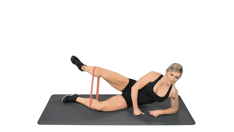 - Bước 1: Dây kháng lực đặt phía trên đầu gối, tư thế nằm nghiêng sang bên trái sao cho hông, đầu gối và mắt cá chân thẳng hàng. Đồn thời tay trái gập vuông góc và trụ nâng người lên. Đầu gối gập thành một góc 90 độ.