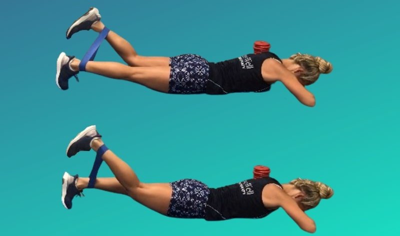 - Bước 1: Tư thế nằm úp trên thảm tập, đặt dây kháng lực vòng quanh mắt cá chân.
