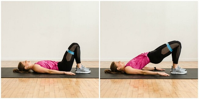 Bài tập Glute Bridges tác động lên vùng cơ mông giúp tăng sức bền hiệu quả. Cách tập như sau: