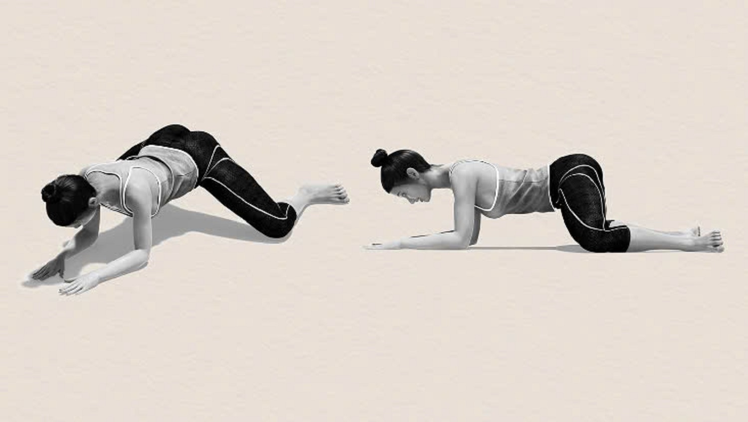 - Bước 2: Gập khuỷu tay sao cho tạo với cánh tay một góc 90 độ. Mở rộng đầu gối cho đến khi cảm thấy thoải mái nhất, cẳng chân và mắt cá chân áp xuống thảm. Nâng hông lên khỏi thảm, đồng thời để ngực và cằm chạm thảm.