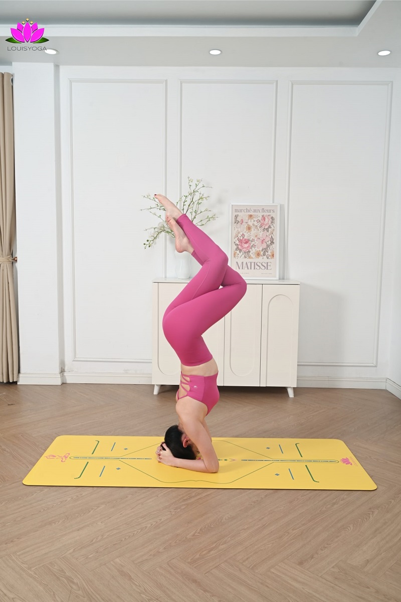 - Bước 5: Ổn định hơi thở, sau đó đưa chân còn lại lên, bắt đầu nâng chân lên từ từ lên cao theo phương thẳng đứng để hoàn thành bài tập trồng chuối ngược bằng đầu. Co gối lại rồi hạ từ từ từng chân xuống sàn.